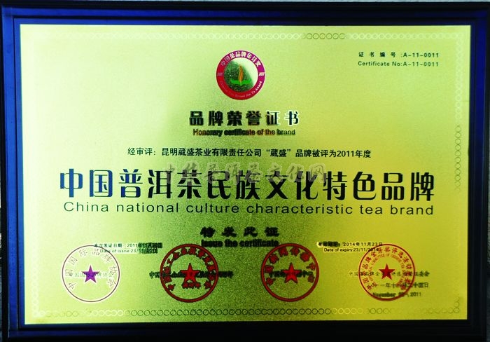 葳盛茶業(yè)榮獲國家級殊榮——“葳盛品牌榮膺‘2011金芽獎’中國普洱茶民族文化特色品牌”