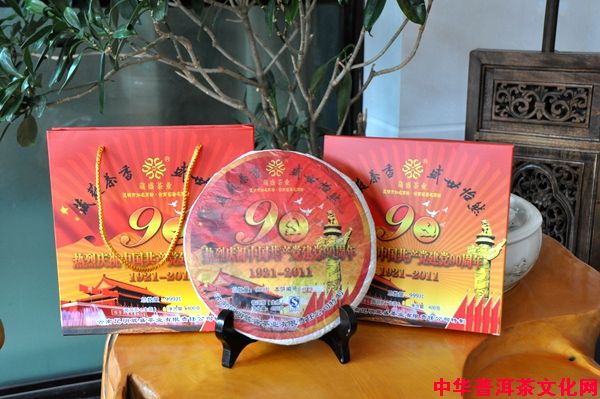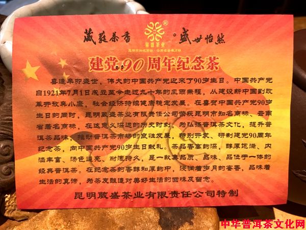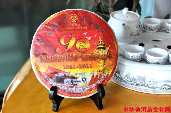 在喜賀中國共產(chǎn)黨90歲生日的同時(shí),昆明葳盛茶業(yè)有限責(zé)任公司榮獲昆明市知名商標(biāo)、云南省著名商標(biāo),在這意義深遠(yuǎn)的歷史時(shí)刻,為弘揚(yáng)普洱茶文化,提升普洱茶品味,推動(dòng)普洱茶市場的良性發(fā)展,特別開發(fā)、研制建黨90周年紀(jì)念茶,向中國共產(chǎn)黨90歲生日獻(xiàn)禮。90周年紀(jì)念普洱茶至今已有6歲啦,在以后的日子里,它將始終如一地伴隨著黨的成長,見證黨的光輝歷程。