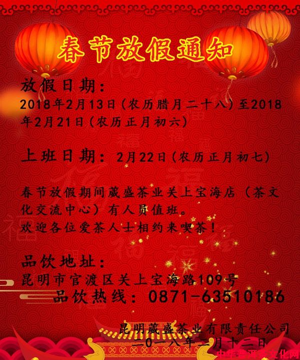 新年伊始、萬象更新,值此新春佳節(jié)之際,首先對各界茶人朋友們在2017年對本公司的支持和幫助表示衷心的感謝。過去的一年中,在您的支持和信賴下,我們才得以在激烈的市場環(huán)境下不斷大步挺進(jìn)!在此昆明葳盛茶業(yè)有限責(zé)任公司董事長張明春先生攜全體員工恭祝諸位:新年快樂!闔家歡樂!萬事如意!
