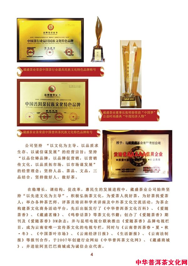 在經(jīng)受市場(chǎng)檢驗(yàn)的同時(shí),葳盛茶業(yè)一直不忘初心,堅(jiān)持做健康普洱、品味普洱、技藝普洱、文化普洱,贏(yíng)得了消費(fèi)者良好口碑。2011年葳盛茶業(yè)品牌上榜“中國(guó)普洱茶民族文化特色品牌”,2014年葳盛茶業(yè)榮登“”中國(guó)茶行業(yè)最具民族文化特色品牌”。