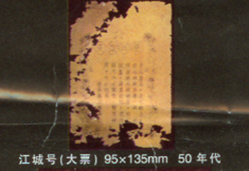 江城圓茶和普慶圓茶一樣,是只有內(nèi)票而沒有內(nèi)飛的圓茶。內(nèi)票規(guī)格是11厘米×16厘米立式長方形,米黃色底,黑色油墨印刷的圖字,是以手刻蠟紙,手工油印。而且還有幾個(gè)不同的版本。其圖案文字內(nèi)容完全一樣,但字體筆法各異,是過去普洱茶中極少見的現(xiàn)象。餅身結(jié)買,壓模技術(shù)特殊,餅面不平,邊緣厚薄不一致。餅身直徑19.5厘米,每餅重約320克,手感很強(qiáng),條索扁長,色澤栗黃,茶菁油光  整體外形和敬昌圓茶非常相似,典型大葉種普洱茶外觀特色。樟香較敬昌圓茶為弱,有一股濃厚青香老茶香,到達(dá)老韻程度。水性較薄但柔滑和順,舌面生津,茶氣普通,的確是優(yōu)良普洱茶品.